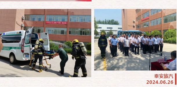 為全面強(qiáng)化公司安全管理,切實(shí)提高全體職工的安全意識和安全素養(yǎng),貫徹落實(shí)行業(yè)主管部門關(guān)于安全生產(chǎn)工作重要指示精神和安全生產(chǎn)月活動(dòng)統(tǒng)一部署,6月26日上午,泰山文旅集團(tuán)泰安旅汽結(jié)合實(shí)際,緊緊圍繞2024年第23個(gè)安全月“人人講安全  個(gè)個(gè)會(huì)應(yīng)急——暢通生命通道”的活動(dòng)主題,組織進(jìn)行了辦公樓火災(zāi)逃生綜合應(yīng)急預(yù)案演練和車輛起火現(xiàn)場處置預(yù)案演練。本次活動(dòng)邀請到市交通運(yùn)輸局、交警支隊(duì)、消防大隊(duì)、中心血站、文旅產(chǎn)投集團(tuán)相關(guān)單位領(lǐng)導(dǎo)蒞臨現(xiàn)場觀摩指導(dǎo)。
